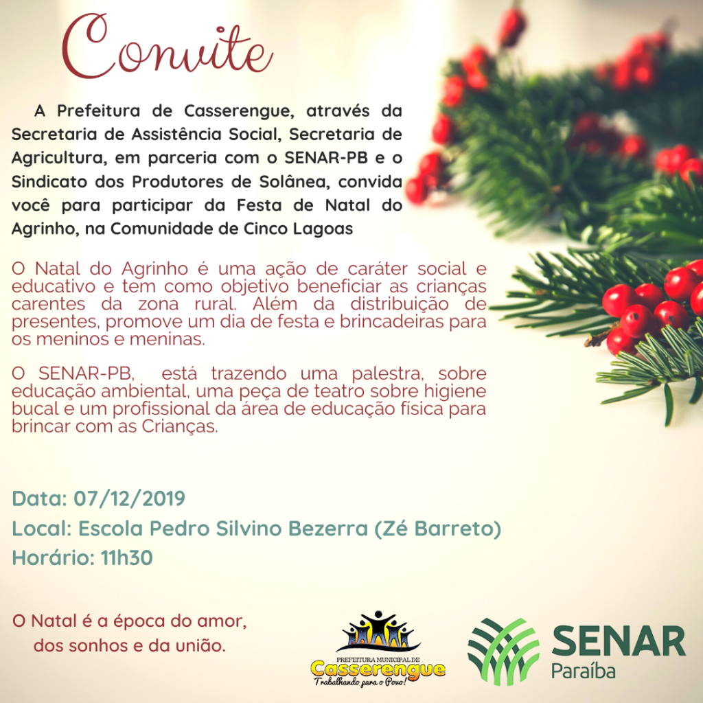 A Prefeitura de Casserengue, através da Secretaria de Assistência Social, Secretaria de Agricultura, em parceria com o SENAR-PB e o Sindicato dos Produtores de Solânea, convida você para participar da Festa de Natal do Agrinho, na Comunidade de Cinco Lagoas