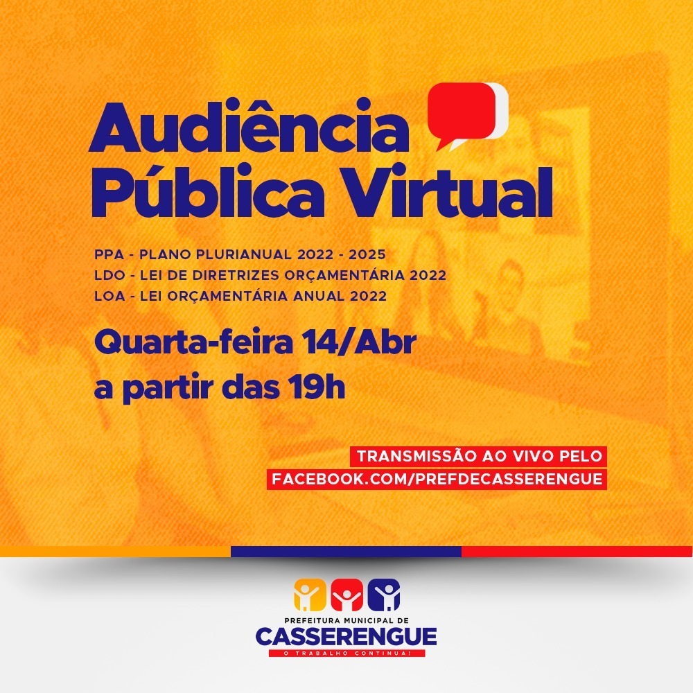 A Prefeitura Municipal de Casserengue realizará nesta quarta-feira, 14 de abril de 2021, às 19h a Audiência Pública para a apresentação da Lei de Diretrizes Orçamentárias (LDO) e da Lei Orçamentária Anual (LOA) e Plano Plurianual (PPA) 2022/2025.