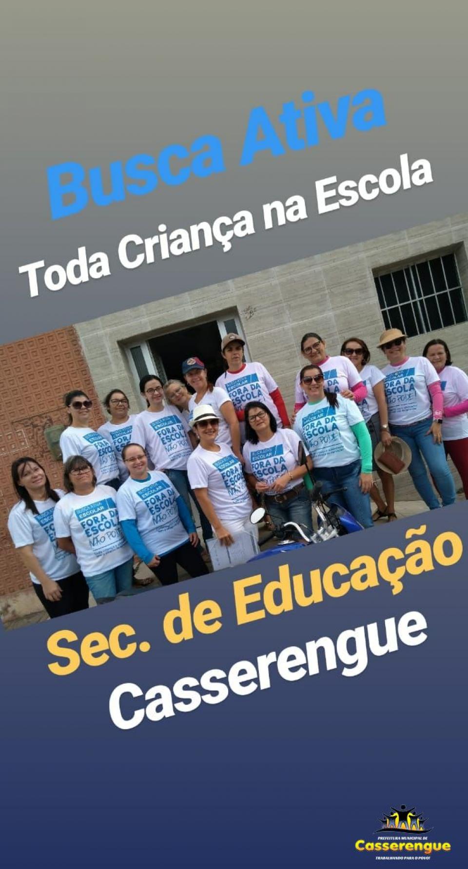 Hoje no Brasil existem milhões de crianças e adolescentes que estão fora da escola deixando de exercer o direito fundamental à educação. É para enfrentar essa situação que a prefeitura municipal de Casserengue junto com a secretaria de educação está realizando a Busca Ativa Escolar, que consiste em um conjunto de ações que vão permitir identificar e trazer de volta à escola essas crianças e adolescentes que estão fora. É garantido por lei que toda criança e adolescente entre 4 e 17 anos estejam matriculadas e frequentando a escola. O município oferece ainda novas vagas para crianças de 2 e 3 anos e também educação de jovens e adultos. Venha fazer parte desse time campeão.