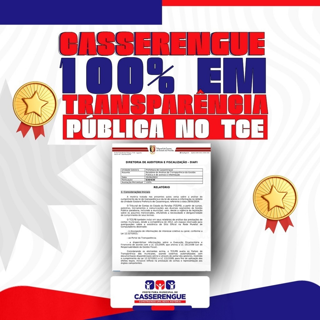 A prefeitura de Casserengue conquistou 100% em transparência pública no TCE!