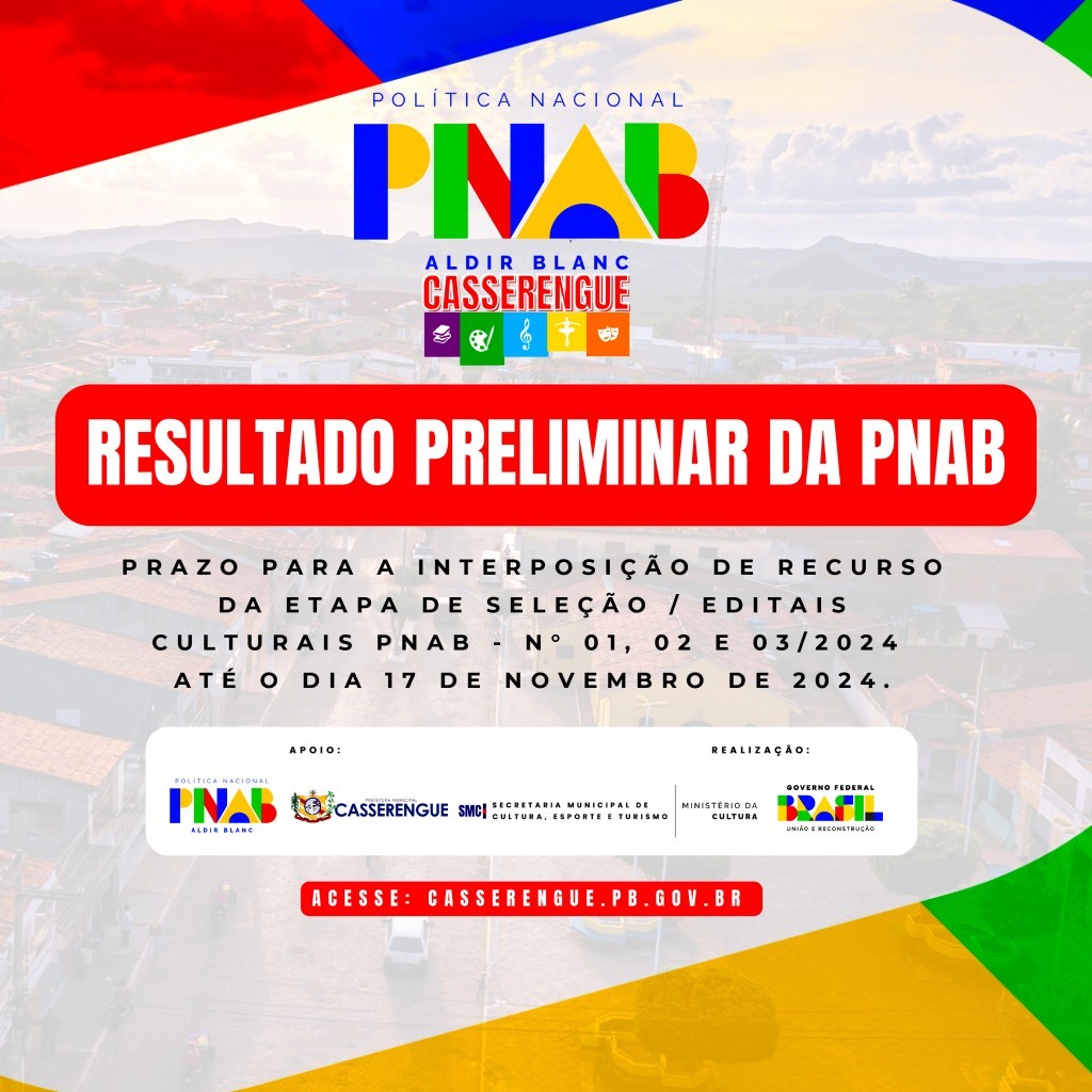 A Prefeitura de Casserengue informa aos participantes dos Editais Culturais da Política Nacional Aldir Blanc (PNAB) de números 01, 02 e 03/2024 que o prazo para interposição de recursos referente à etapa de seleção está aberto até o dia 17 de novembro de 2024.