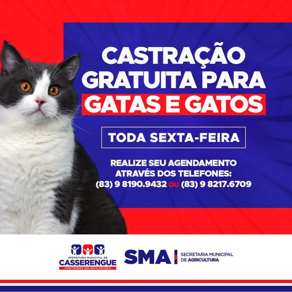 A Secretaria Municipal de Agricultura informa que estará realizando toda sexta-feira, a Castração de Gatos e Gatas no município.