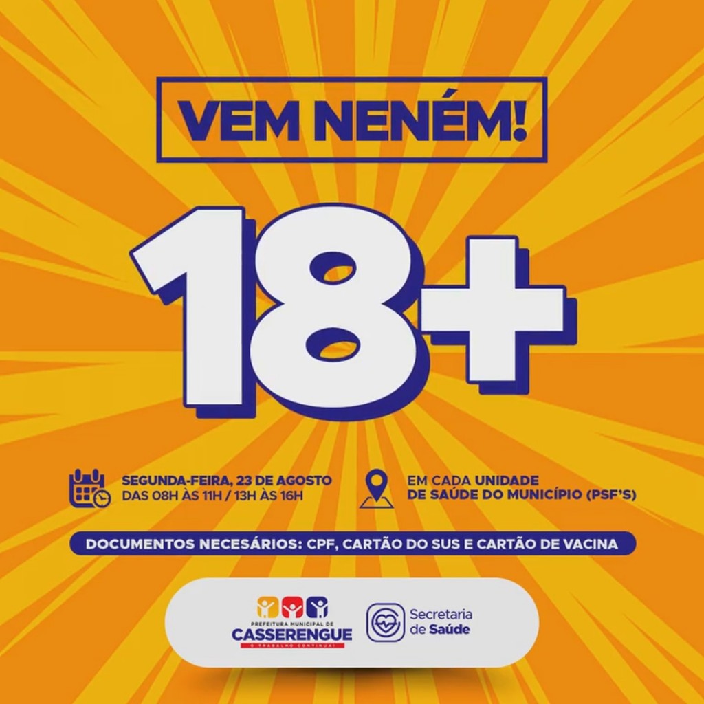 Nesta segunda-feira (23/Ago) iniciaremos a vacinação de TODOS OS NOVINHOS & NOVINHAS (18+) de nossa #Casserengue ⚡💛 A vacinação ocorrerá nos períodos da manhã e tarde em todas as unidades de saúde do município.