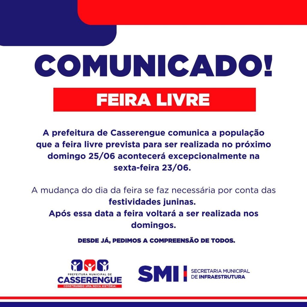 A prefeitura de Casserengue comunica a população que a feira livre prevista para ser realizada no próximo domingo 25/06 acontecerá excepcionalmente na sexta-feira 23/06.