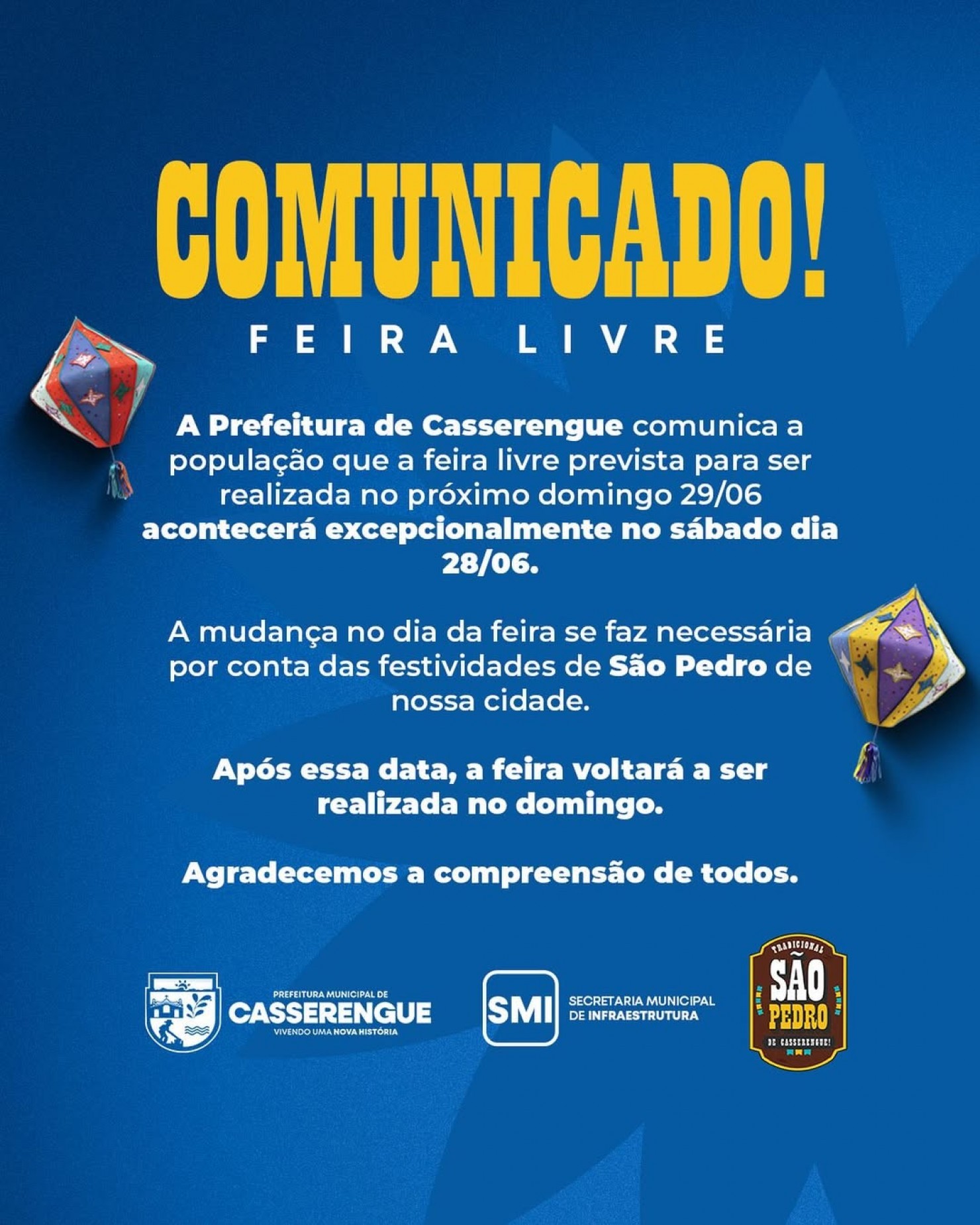 A mudança no dia da feira se faz necessária por conta das festividades de São Pedro de nossa cidade.