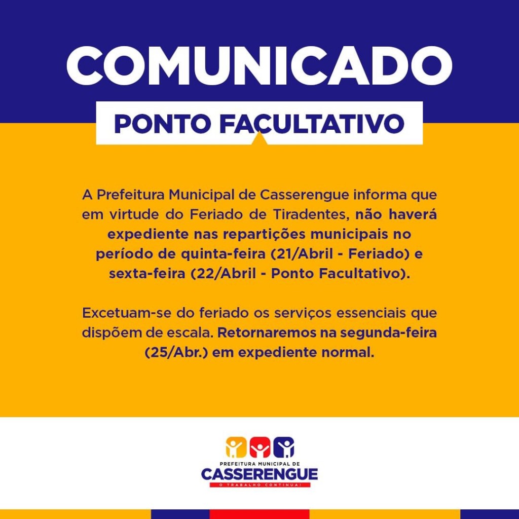 A Prefeitura Municipal de Casserengue informa que em virtude do Feriado de Tiradentes, não haverá expediente nas repartições municipais no período de quinta-feira (21/Abril - Feriado) e sexta-feira (22/Abril - Ponto Facultativo).