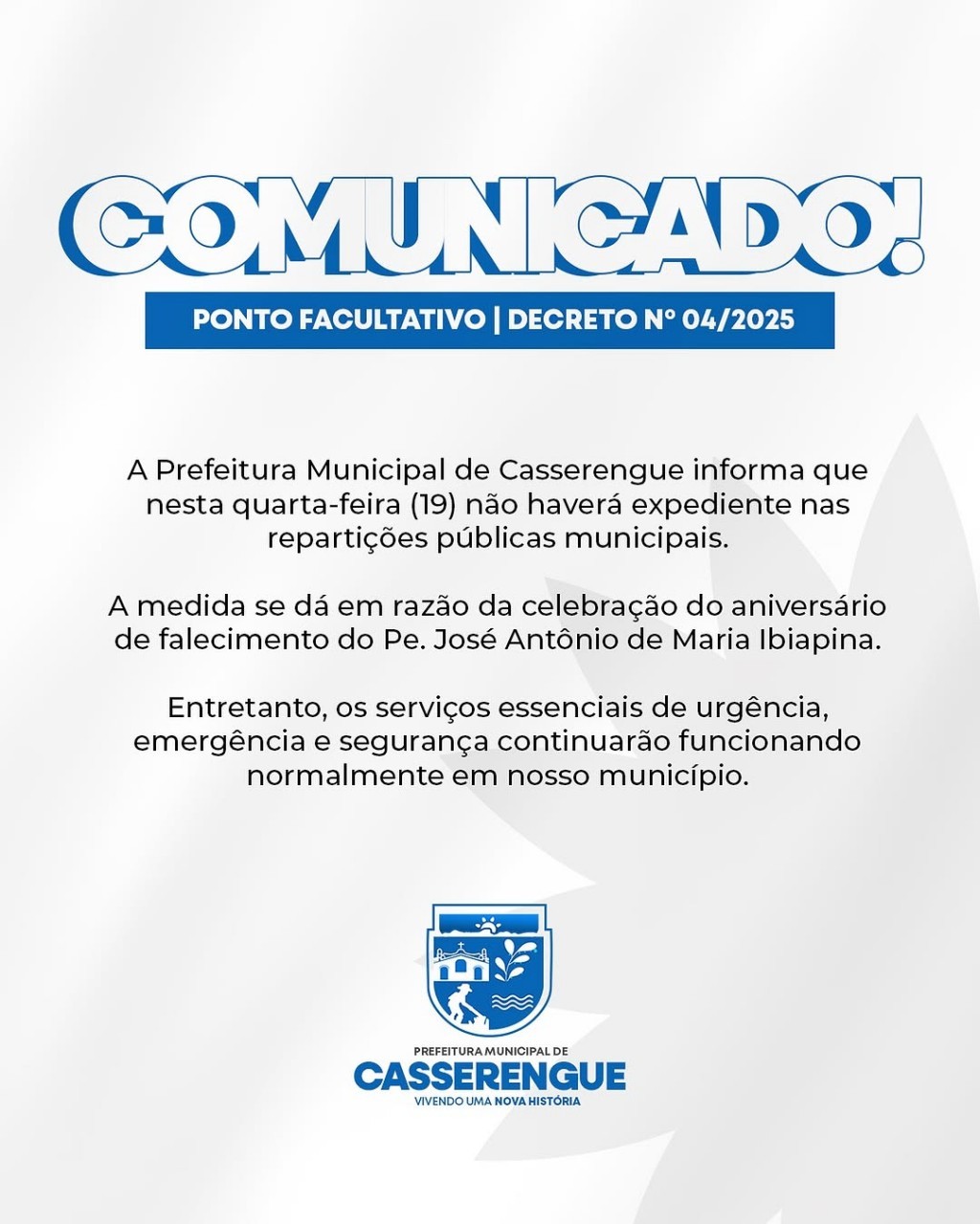 A Prefeitura Municipal de Casserengue informa que nesta quarta-feira (19) não haverá expediente nas repartições públicas municipais.