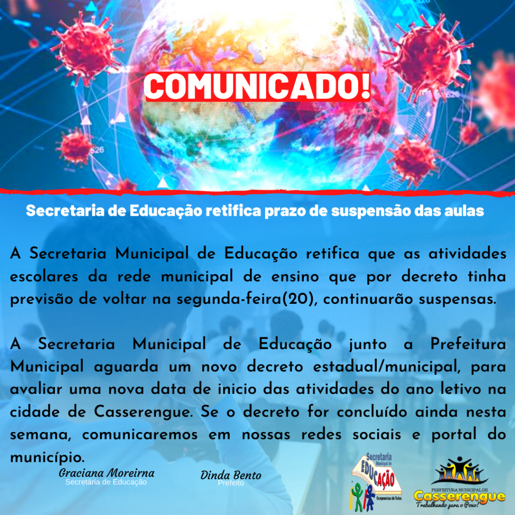 A Secretaria Municipal de Educação comunica que as atividades escolares da rede municipal de ensino que por decreto tinha previsão de voltar na segunda-feira(20), está adiado provavelmente para o dia 03 de maio de 2020.