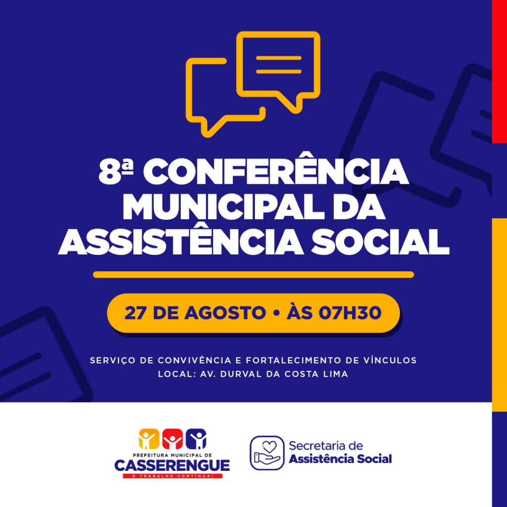 Nesta sexta-feira (27/ago), será realizada a 8ª Conferência Municipal da Assistência Social em nosso município. O evento ocorrerá no Serviço de Convivência e Fortalecimento de Vínculos (Local: Avenida Durval da Costa Lima), a partir das 08h.