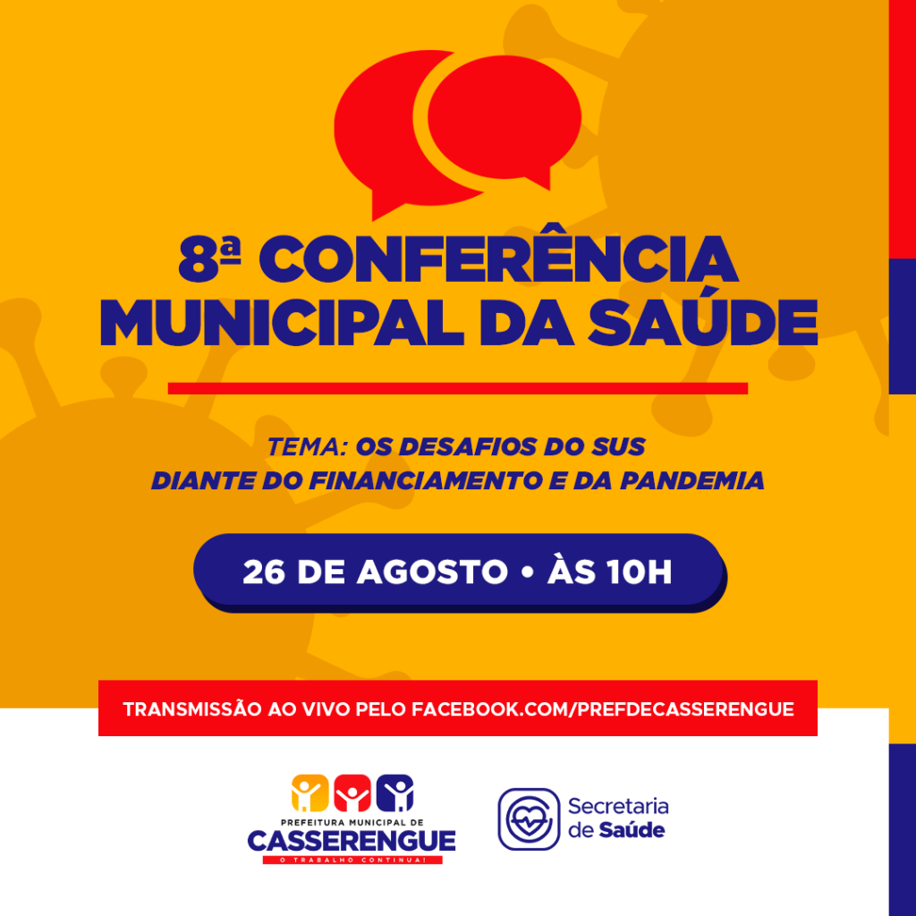 A 8ª Conferência Municipal da Saúde será realizada nesta quinta-feira (26/Ago) a partir das 10h e será transmitida de forma virtual.
