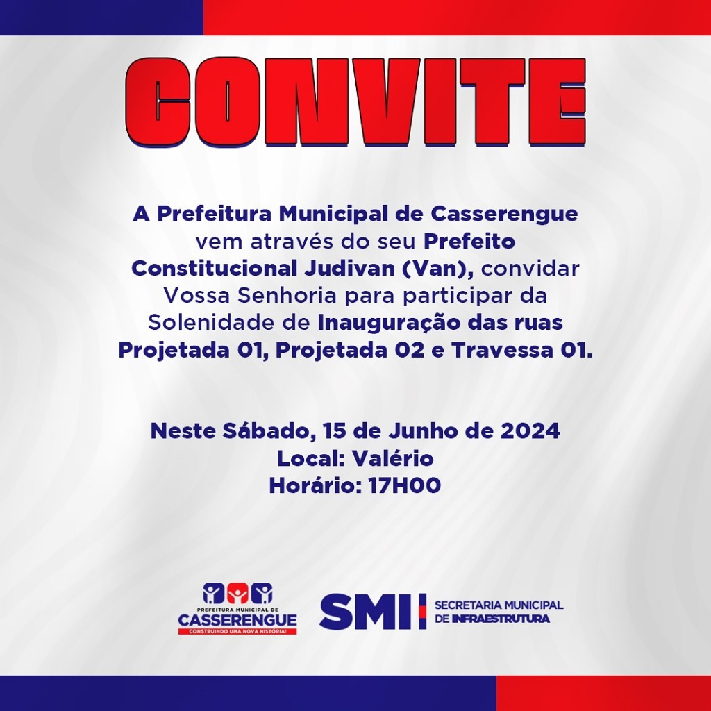 A Prefeitura Municipal de Casserengue vem através do seu Prefeito Constitucional Judivan (Van de Galega), convidar Vossa Senhoria para participar da Solenidade de Inauguração das Ruas Projetada 01, Projetada 02 e Travessa 01.