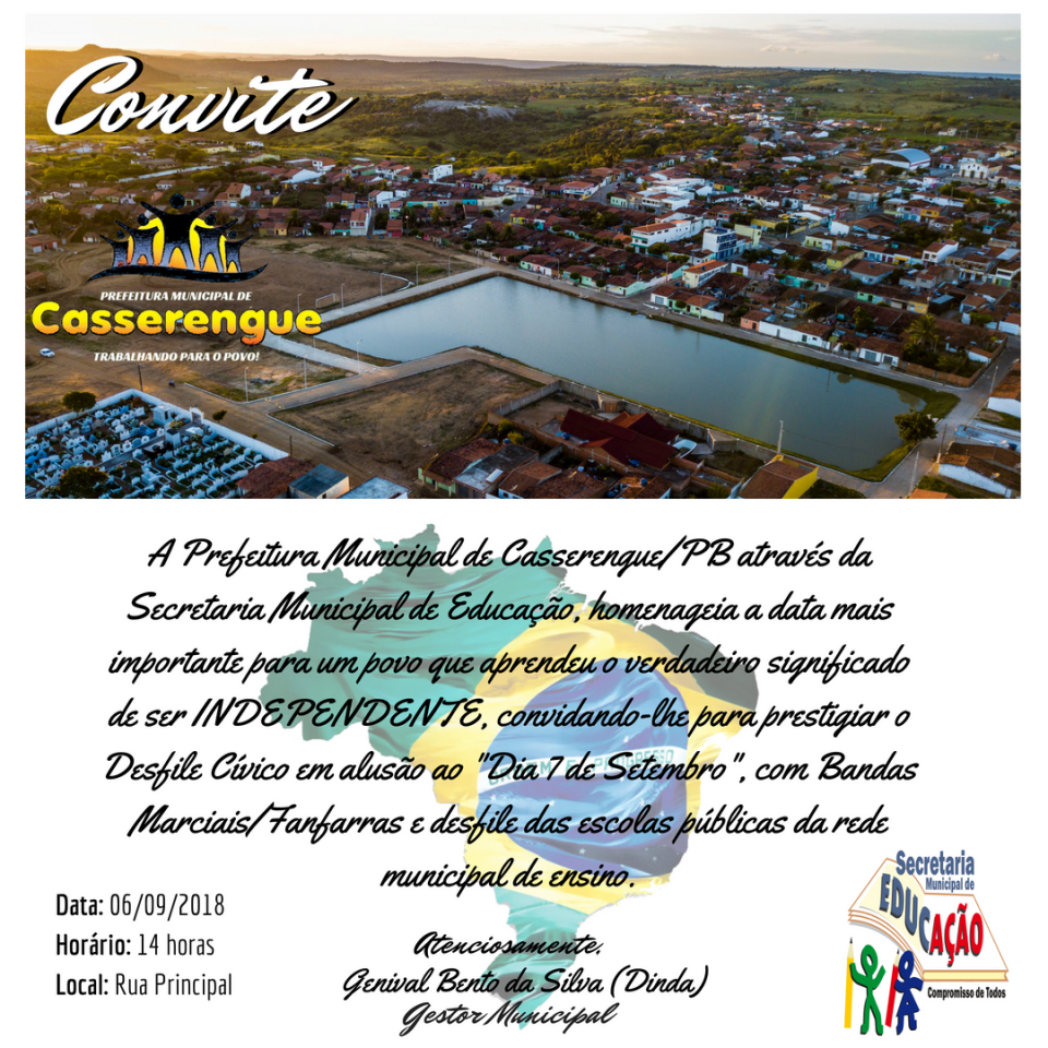 A Prefeitura Municipal de Casserengue/PB através da Secretaria Municipal de Educação, homenageia a data mais importante para um povo que aprendeu o verdadeiro significado de ser INDEPENDENTE, convidando-lhe para prestigiar o Desfile Cívico em alusão ao "Dia 7 de Setembro" com Bandas Marciais/Fanfarras e desfile das escolas públicas da rede municipal de ensino.