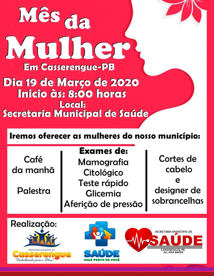 A Secretaria Municipal de Saúde de Casserengue vai realizar ações de promoção à saúde em alusão ao Dia Internacional da Mulher, comemorado em 8 de março. A programação será na quinta-feira (19) na Secretaria Municipal de Saúde, com inicio às 08h00.