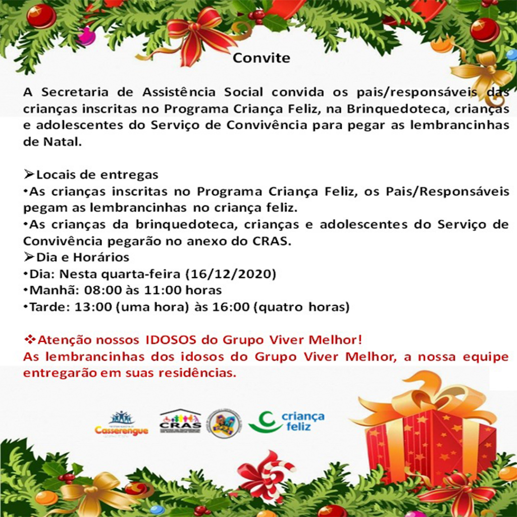 Convite de entrega das lembrancinhas de Natal para as nossas Crianças inscritas no Programa Criança Feliz, Brinquedoteca e Crianças e Adolescentes do Serviço de Convivência.