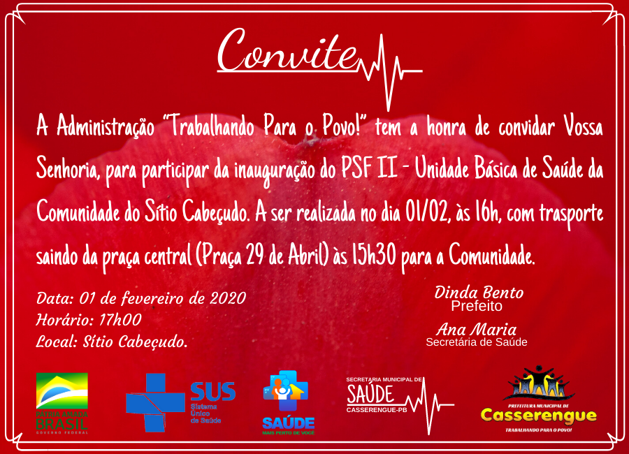 A Administração “Trabalhando Para o Povo!” tem a honra de convidar Vossa Senhoria, para participar da inauguração do PSF II - Unidade Básica de Saúde da Comunidade do Sítio Cabeçudo. A ser realizada no dia 01/02, às 16h, com trasporte saindo da praça central (Praça 29 de Abril) às 15h30 para a Comunidade.
