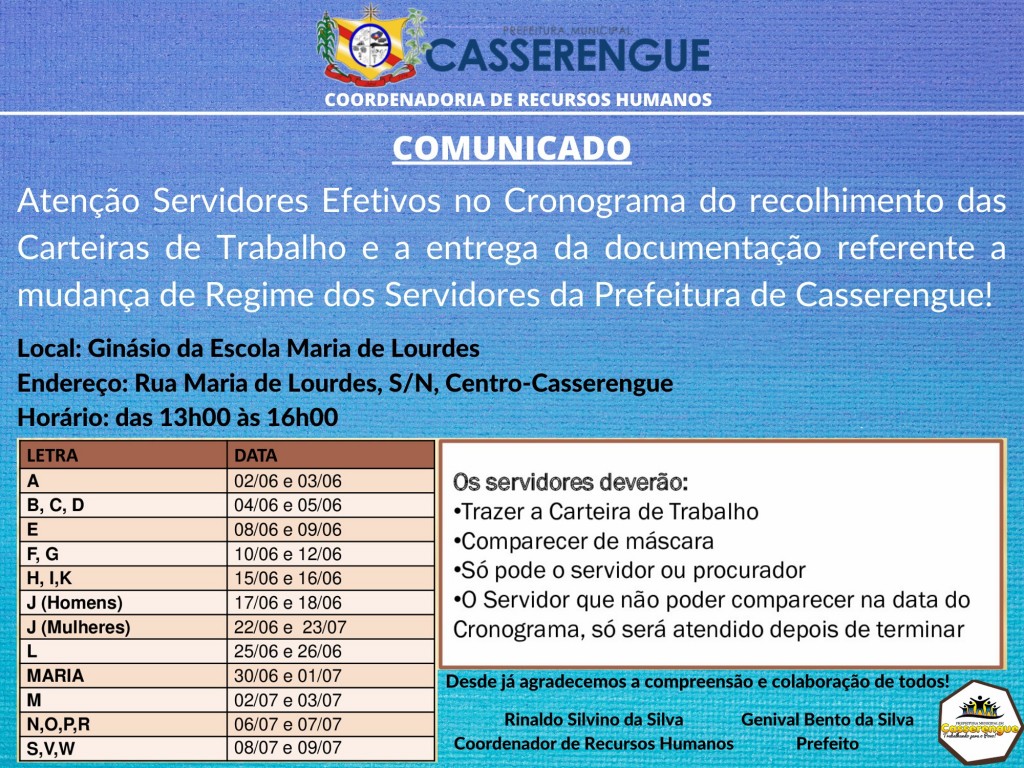 Atenção Servidores Efetivos no Cronograma do recolhimento das Carteiras de Trabalho e a entrega da documentação referente a mudança de Regime dos Servidores da Prefeitura de Casserengue!