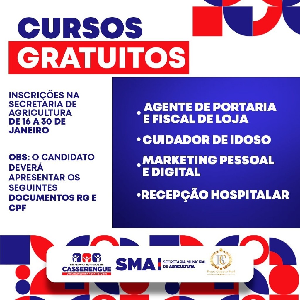 A Prefeitura Municipal de Casserengue, por meio da Secretaria de Agricultura informa que estão abertas as inscrições GRATUITAS para os cursos abaixo: