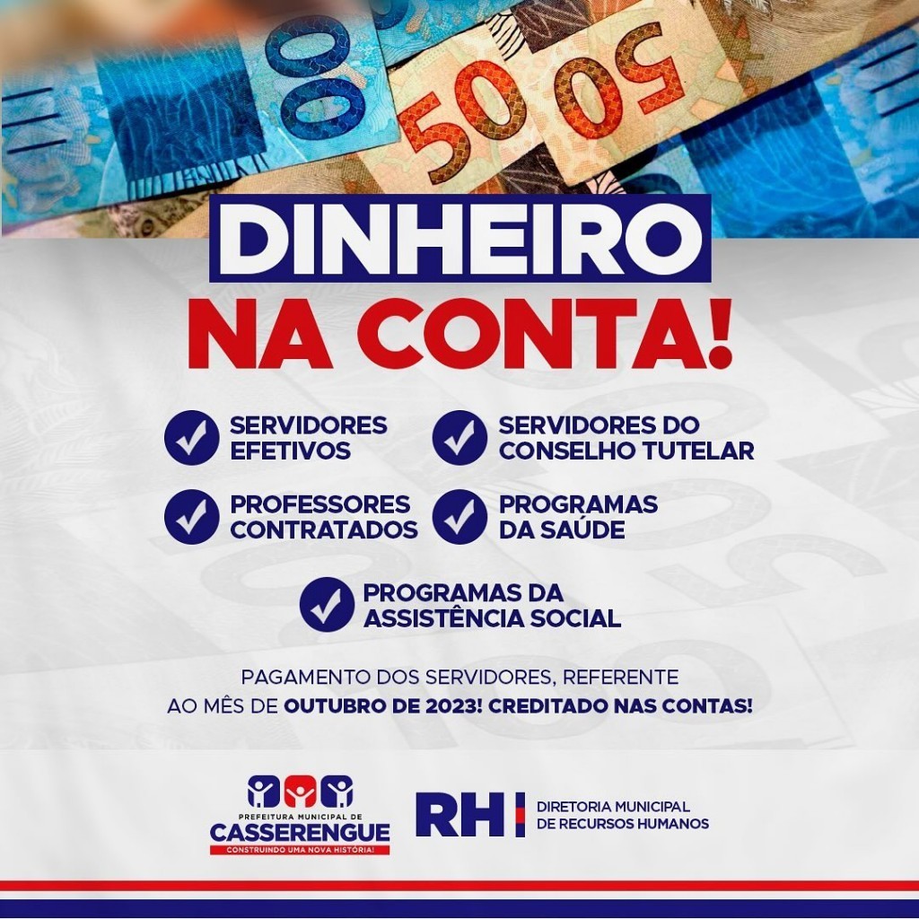 A Prefeitura de Casserengue por meio da Diretoria de Recursos Humanos informa que o pagamento alusivo ao mês de Outubro de 2023 já está disponível em conta para retirada.