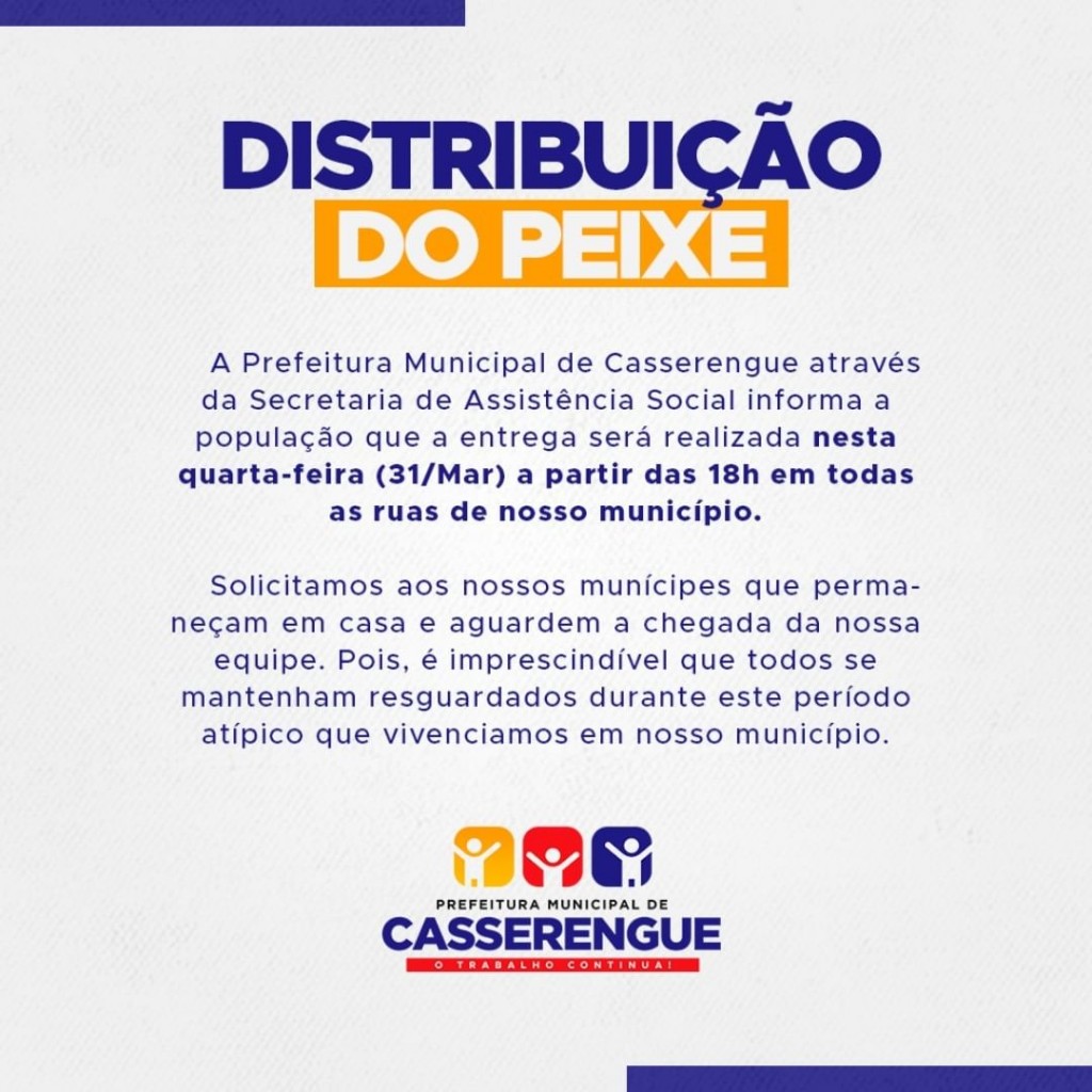 A Prefeitura Municipal de Casserengue através da Secretaria de Assistência Social informa a população que a entrega será realizada nesta quarta-feira (31/Mar) a partir das 18h em todas as ruas de nosso município.