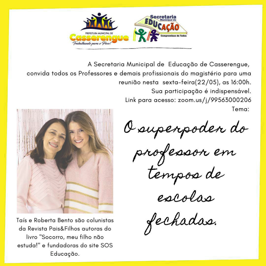 A Secretaria Municipal de Educação de Casserengue, convida todos os professores e demais profissionais do magistério para uma reunião nesta sexta-feira (22/05), às 16h00.
