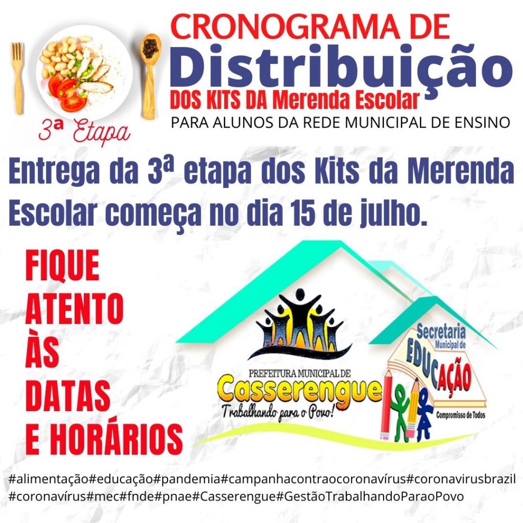 A Prefeitura Municipal de Casserengue através da Secretaria de Educação inicia a partir desta quarta-feira, 15, a entrega da terceira etapa dos Kits da Merenda Escolar para os estudantes da rede municipal de ensino.