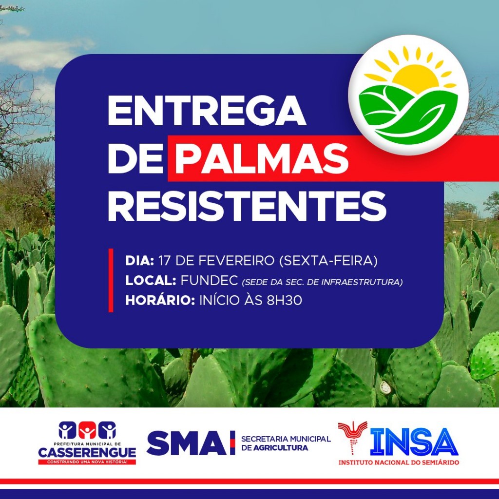 A Gestão Municipal, através da Secretaria Municipal de Agricultura e em parceria com o Instituto Nacional do Semiárido (INSA), realizará na próxima sexta-feira (17/Fev) a entrega de Palmas Resistentes para os agricultores municipais.