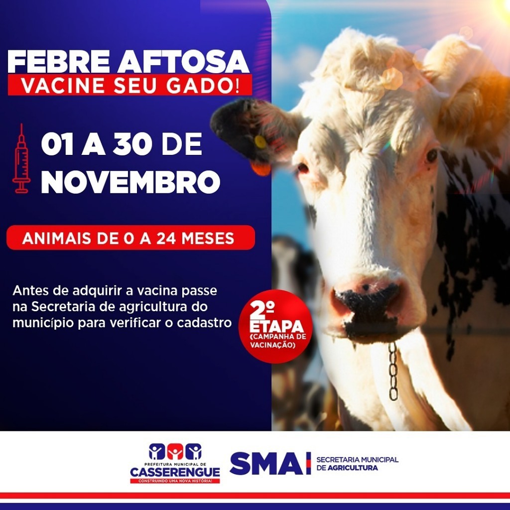 Durante todo o mês de novembro, teremos vacinação contra febre aftosa, em bovinos de até 24 meses.