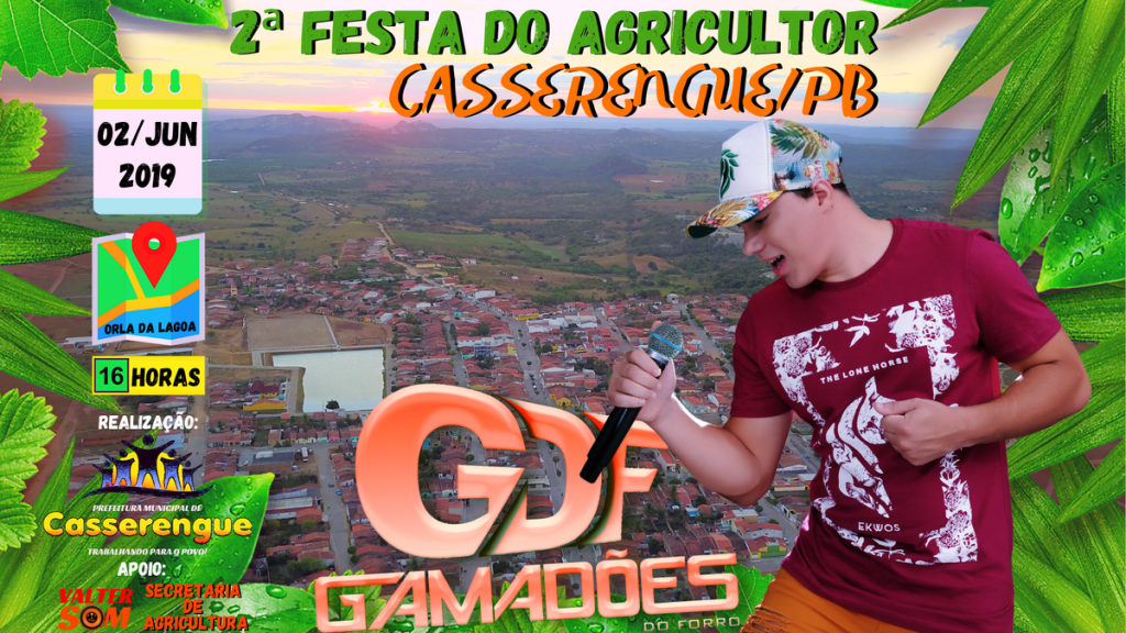 Segunda Festa do Agricultor, uma festa especial que acontecerá no domingo, dia 02 de jun/2019, a partir das 16 horas, na Orla da Lagoa. O evento é promovido pela Prefeitura de Casserengue, por meio da Secretaria Municipal de Agricultura. A festa do agricultor teve sua primeira edição no ano passado (2018), o prefeito Dinda, na primeira edição falou na proposta de tornar o evento uma tradição no nosso município, dando apoio especial aos nossos agricultores e a agricultura familiar.