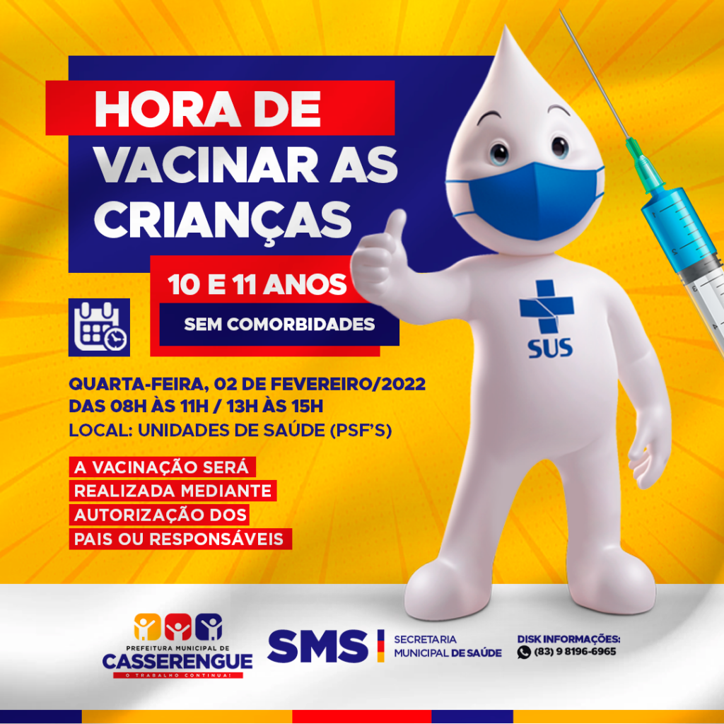 Nesta quarta-feira (02/02), estaremos aplicando a 1ª dose do imunizante contra a covid-19 nas crianças de 10 e 11 anos SEM COMORBIDADES.