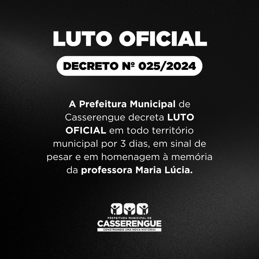 A Prefeitura Municipal de Casserengue decreta LUTO OFICIAL em todo território municipal por 3 dias, em sinal de pesar e em homenagem à memória da Professora Maria Lúcia.