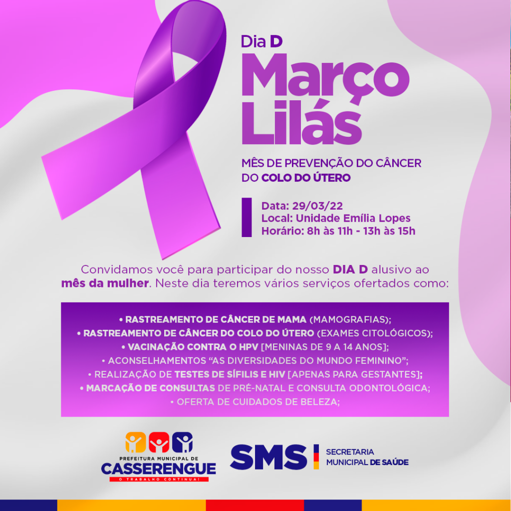 A Prefeitura Municipal de Casserengue através da Secretaria de Saúde, realizará dia 29/03 o Dia com ações importantes voltadas à saúde da mulher.