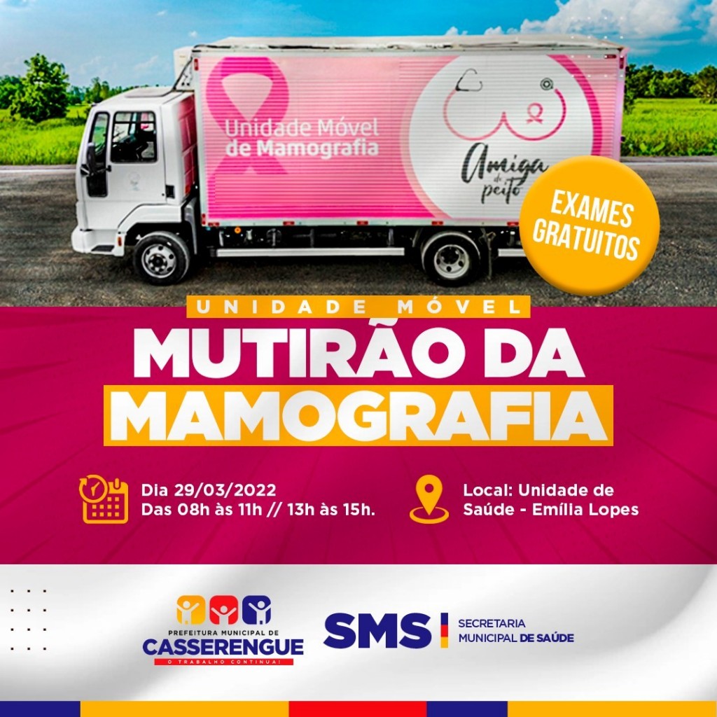 As mulheres de Casserengue poderão realizar exames de mamografia gratuitamente, no Anexo Emília Lopes, através do mamógrafo móvel do Programa "Amigos do Peito". Os exames serão realizados dia 29 de março a partir das 07h30.