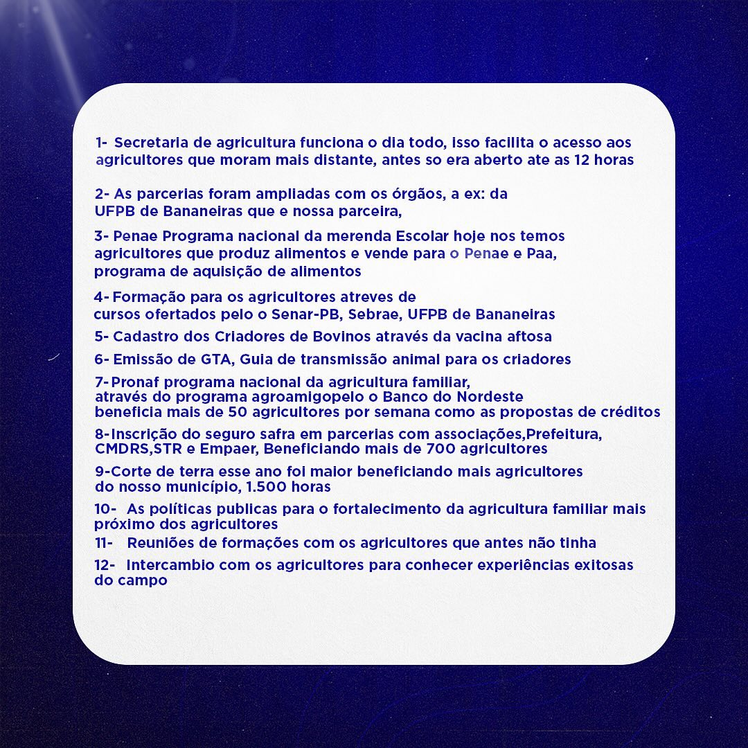 7 - Pronaf programa nacional da agricultura familiar, através do programa agroamigopelo o Banco do Nordeste beneficia mais de 50 agricultores por semana como as propostas de créditos.