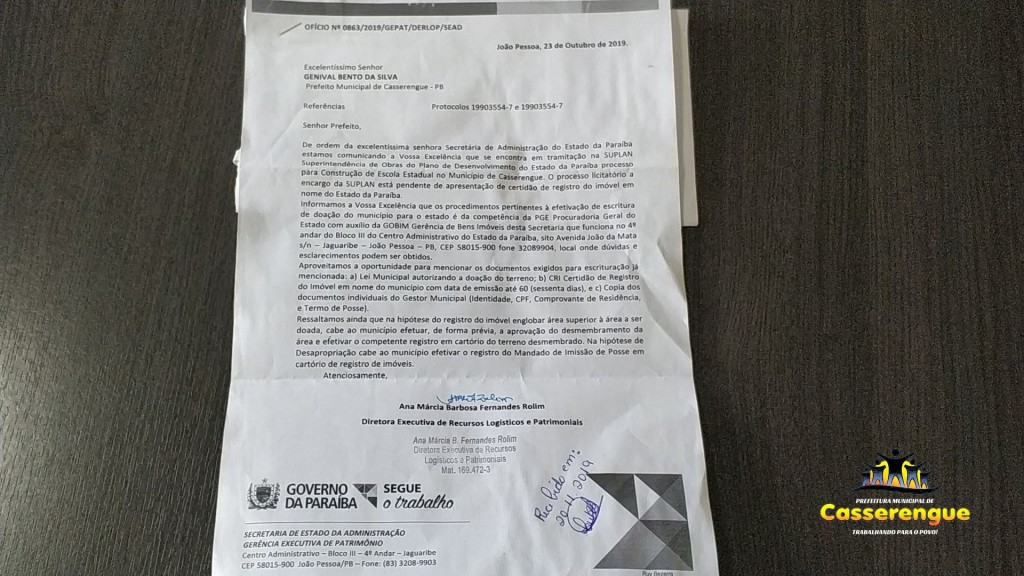 Na manhã desta quarta-feira(20), a prefeitura municipal de Casserengue recebeu um ofício da SUPLAN - Superintendência de Obras do Plano de Desenvolvimento do Estado, o ofício pede que a Prefeitura Municipal de Casserengue agilize o procedimento da escritura do terreno doado pela Prefeitura para que o processo de construção da Escola Estadual do Município seja construída o mais breve possível.