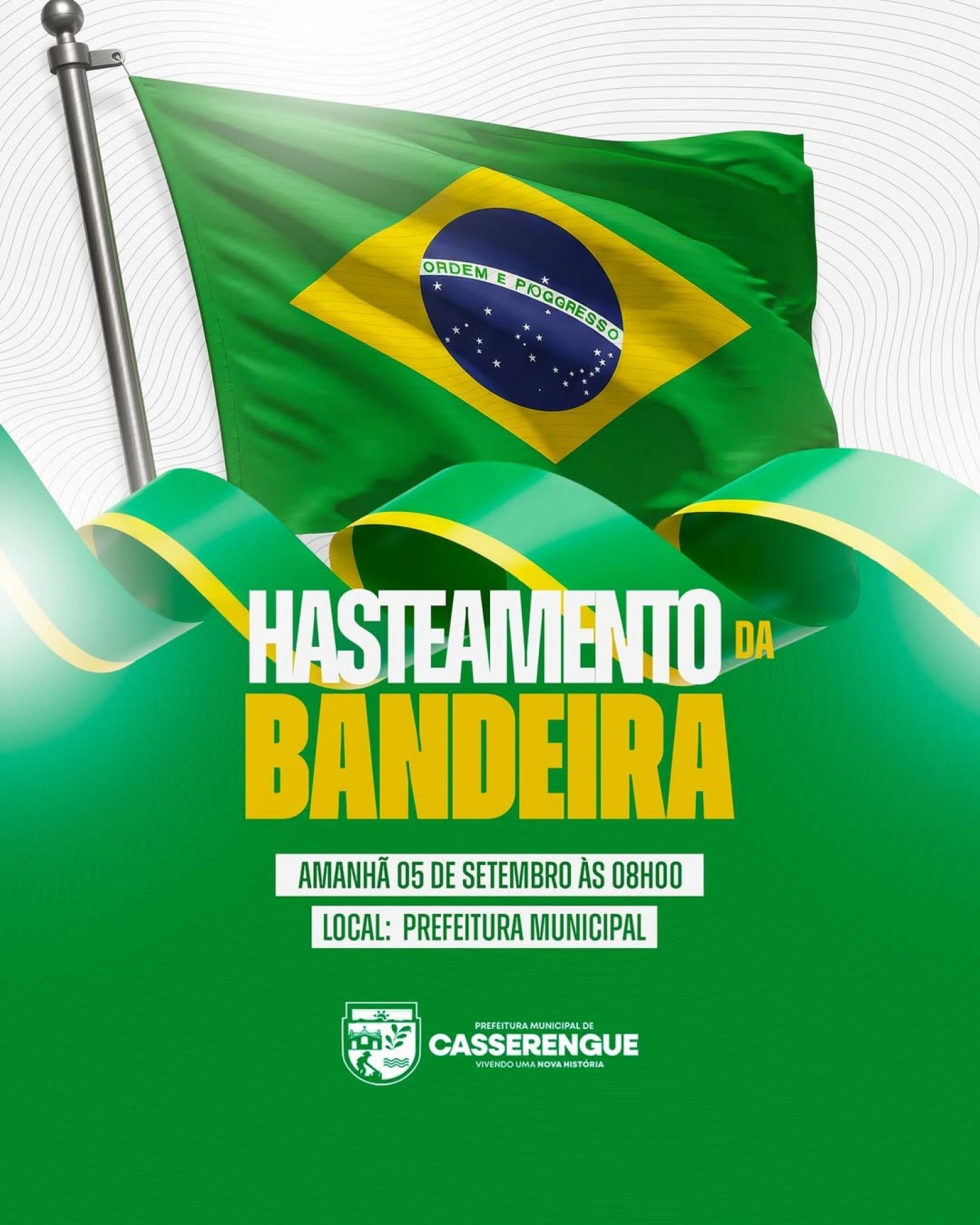 A Prefeitura Municipal de Casserengue convida toda a população para participar da Solenidade de Hasteamento da Bandeira, em alusão à Semana da Pátria e à Independência do Brasil.