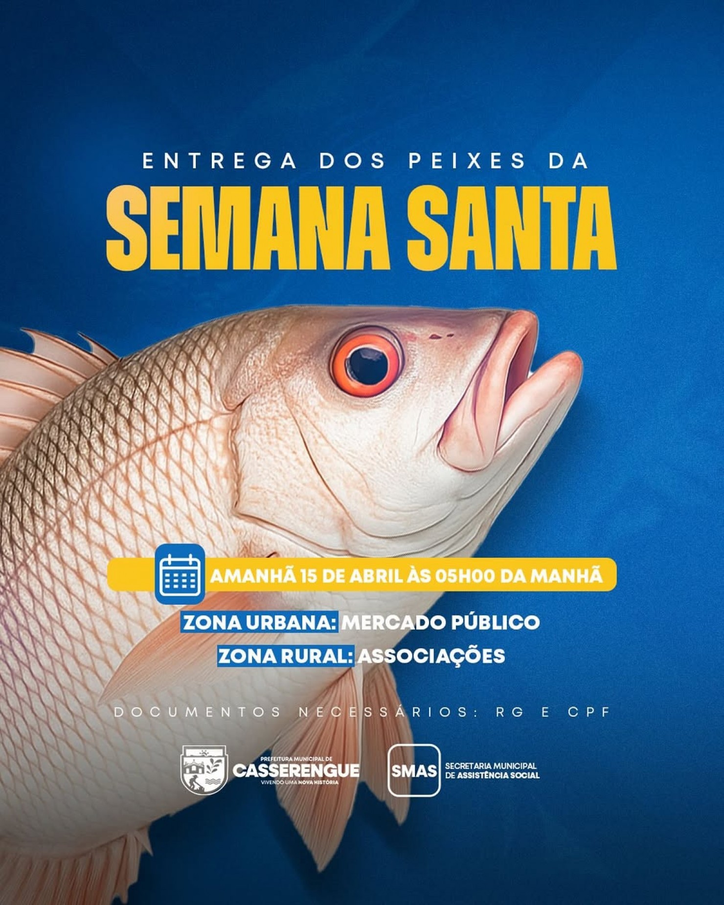 Nesta terça-feira, 15 de abril, a Prefeitura Municipal de Casserengue, por meio da Secretaria Municipal de Assistência Social (SMAS), realizará a entrega do tradicional peixe da Semana Santa às famílias casserenguenses.