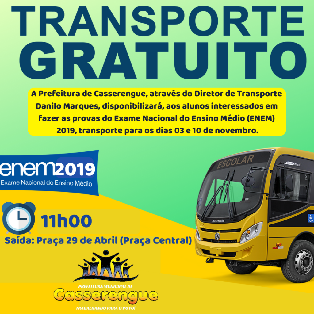 A Prefeitura de Casserengue, através do Diretor de Transporte Danilo Marques, disponibilizará, aos alunos interessados em fazer as provas do Exame Nacional do Ensino Médio (ENEM) 2019, transporte para os dias 03 e 10 de novembro.