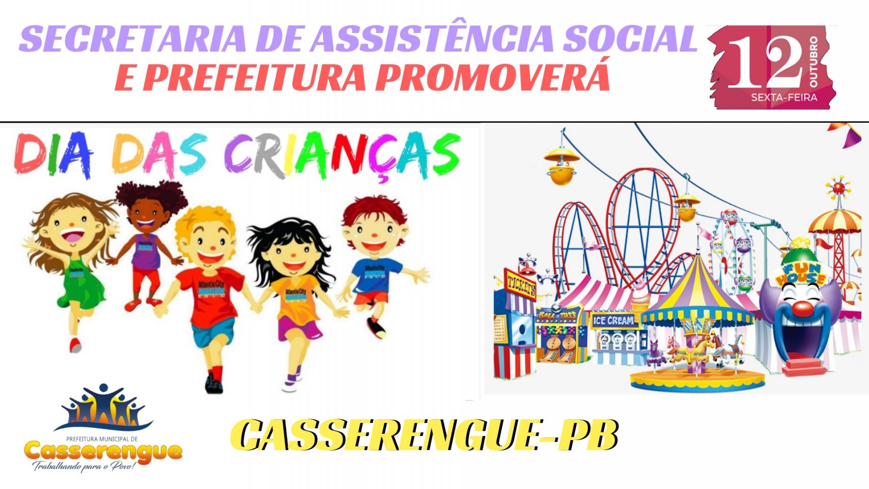 A Prefeitura Municipal de Casserengue por intermédio da Secretaria de Assistência Social, CRAS e Secretaria Municipal de Educação, vai promover nesta sexta-feria - dia 12/10, no turno da tarde "Dia das Crianças" muito especial aberto para toda comunidade.O evento vai ser realizado em Praça Pública com tendas, parque de diversão gratuito, diversos brinquedos, pula pula, cama elástica e vários infláveis. As crianças irão receber o entretenimento e atenção de um grupo de palhaços, tradicional cachorro quente, muita pipoca e refrigerante.