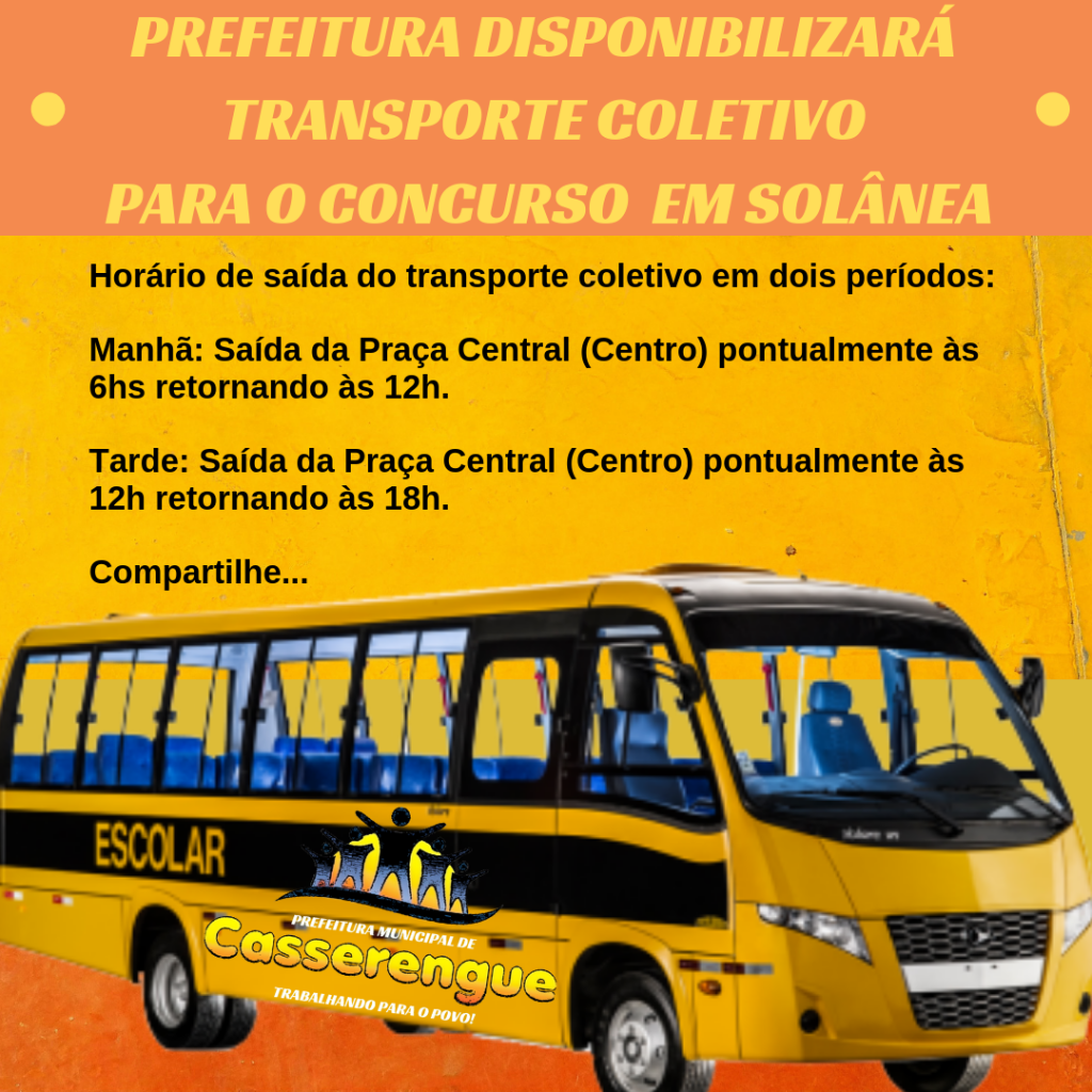 Em nome do Diretor de Transporte Municipal, Danilo Marques, através da Prefeitura Municipal de Casserengue, irá disponibilizar transporte coletivo para o concurso público na cidade de Solânea neste domingo, 14 de julho.