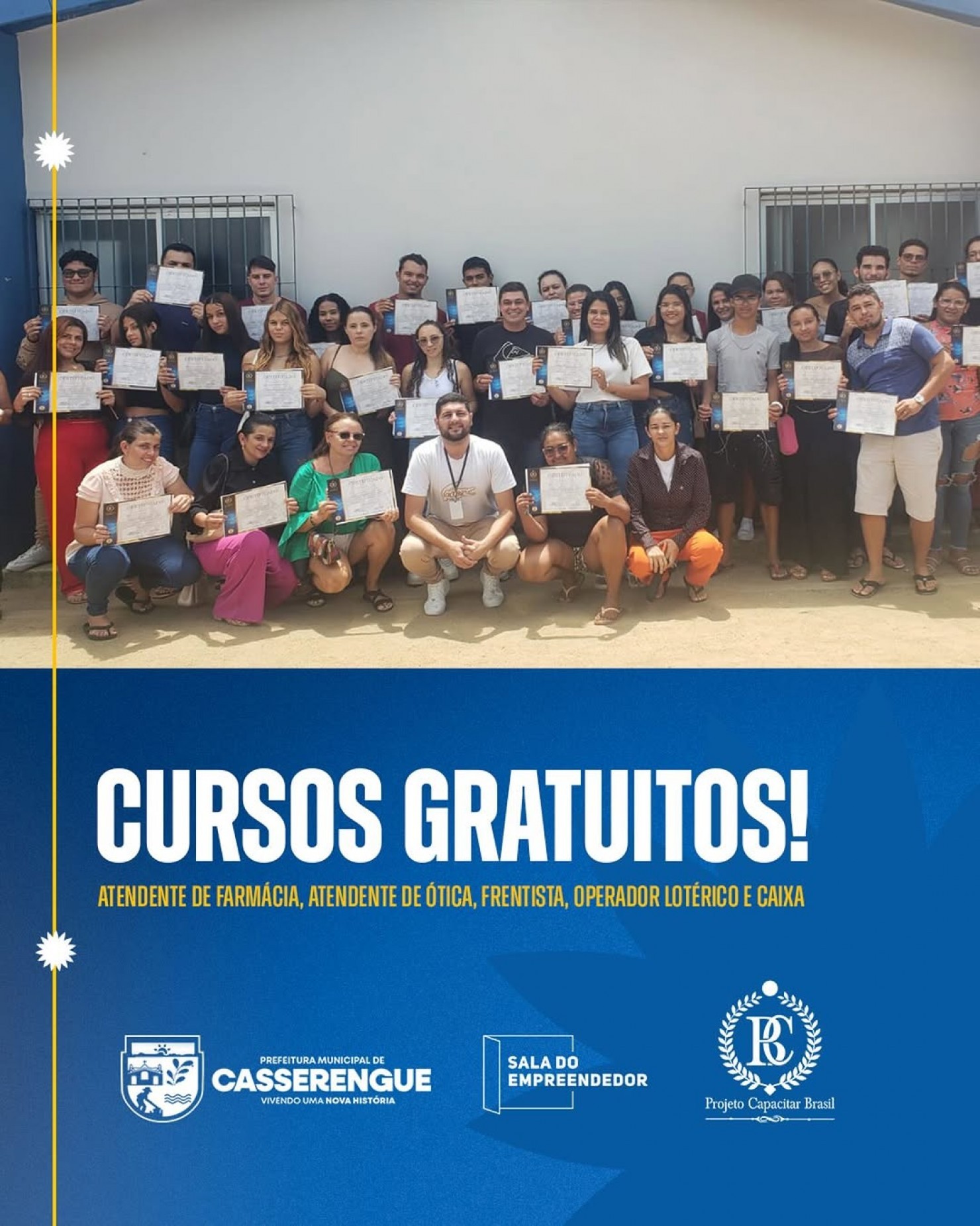A Prefeitura Municipal, em parceria com a Sala do Empreendedor, promoveu, nos dias 05 e 06 de abril, a oferta de cursos de capacitação profissional nas seguintes áreas: Atendente de Farmácia, Atendente de Ótica, Frentista, Operador Lotérico e Operador de Caixa.
