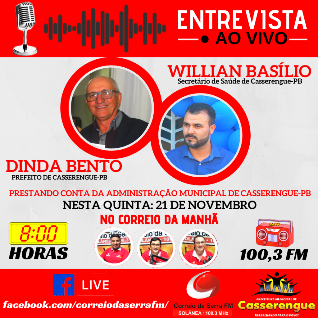 O Prefeito Dinda Bento e o Secretário de Saúde Willian Basílio, concederão entrevista ao Programa Correio da Manhã, da Rádio Correio da Serra (100,3 FM).