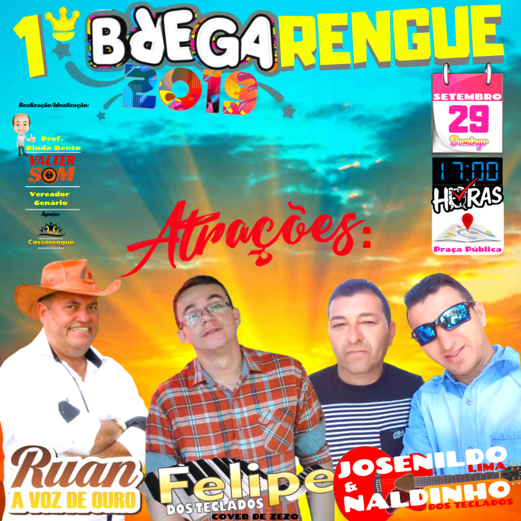 Com uma idealização e realização do Prefeito Dinda Bento, Valter Som, Vereador Genário e apoio da Prefeitura Municipal de Casserengue, o primeiro Bregarengue (Evento musical do gênero brega) está confirmado. O evento será realizado no próximo dia 29 de setembro em praça pública (Praça 29 de Abril - Centro).