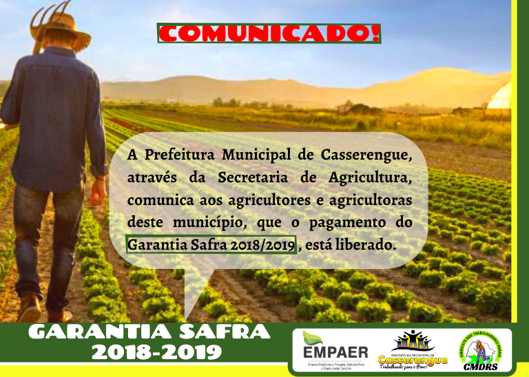 A Prefeitura Municipal de Casserengue, através da Secretaria de Agricultura, comunica aos agricultores e agricultoras deste município, que o pagamento do Garantia Safra 2018/2019 , está liberado.