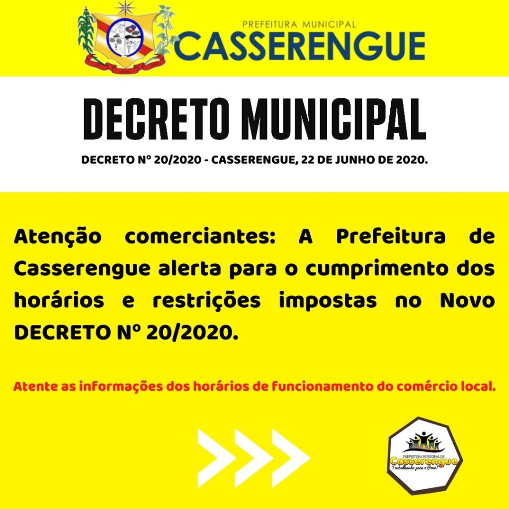 Atenção comerciantes: A Prefeitura de Casserengue alerta para o cumprimento dos horários e restrições impostas no Novo DECRETO Nº 20/2020.
