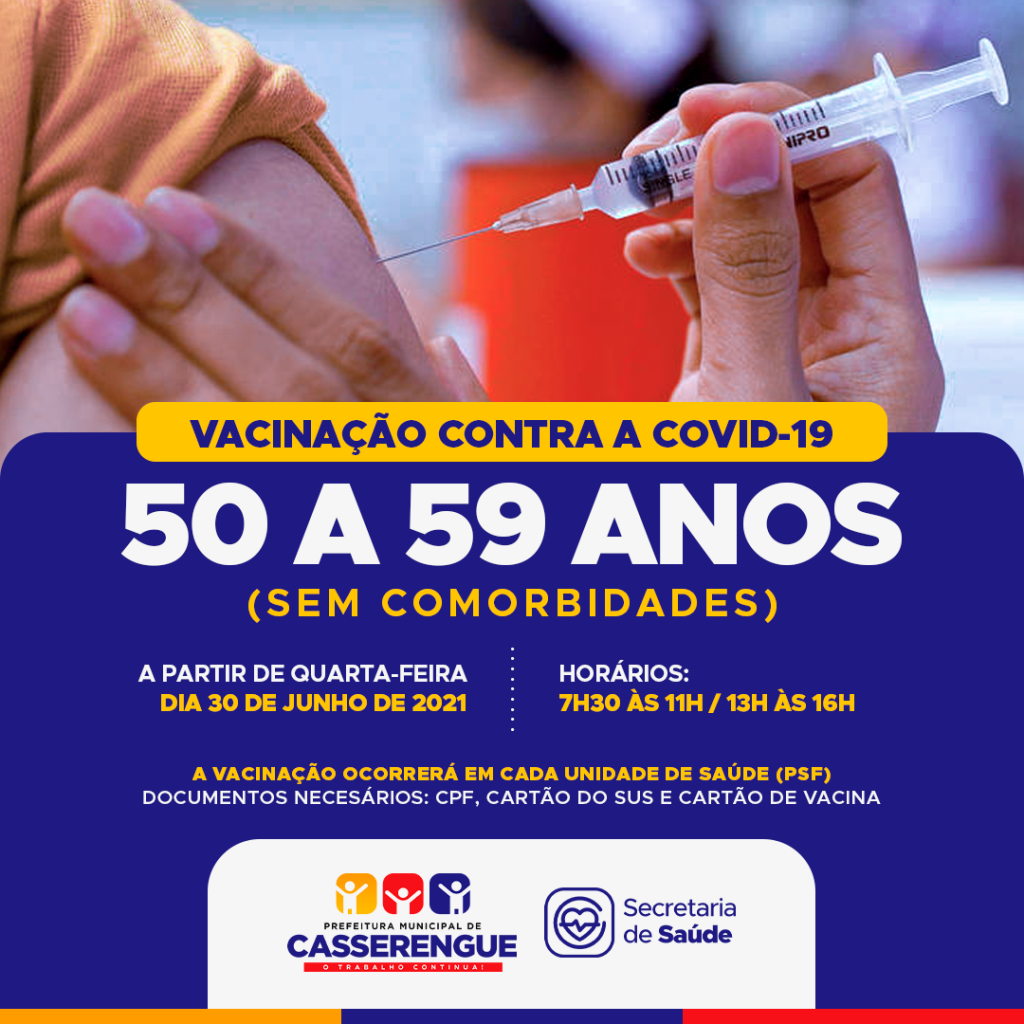 Nesta quarta-feira (30), a Secretaria Municipal de Saúde iniciará a vacinação de mais um grupo prioritário. Agora, pessoas entre 50 e 59 anos (#SemComorbidades) poderão receber sua vacina contra a COVID-19.
