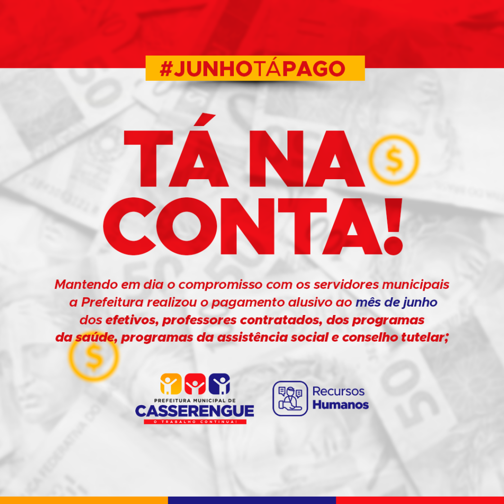 A Prefeitura de Casserengue realizou o pagamento alusivo do mês de junho dos funcionários efetivos, professores contratados, programas de saúde, programas de assistência social e do conselho tutelar nesta quinta-feira (01/julho).