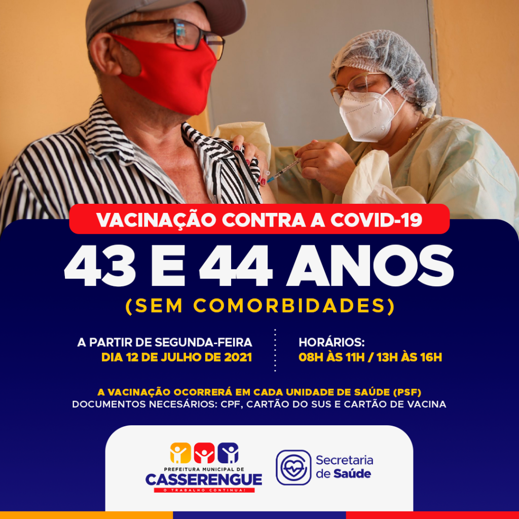 A partir desta segunda-feira (12), iniciaremos a vacinação das pessoas entre 43 e 44 anos sem comorbidades. 🦯💛