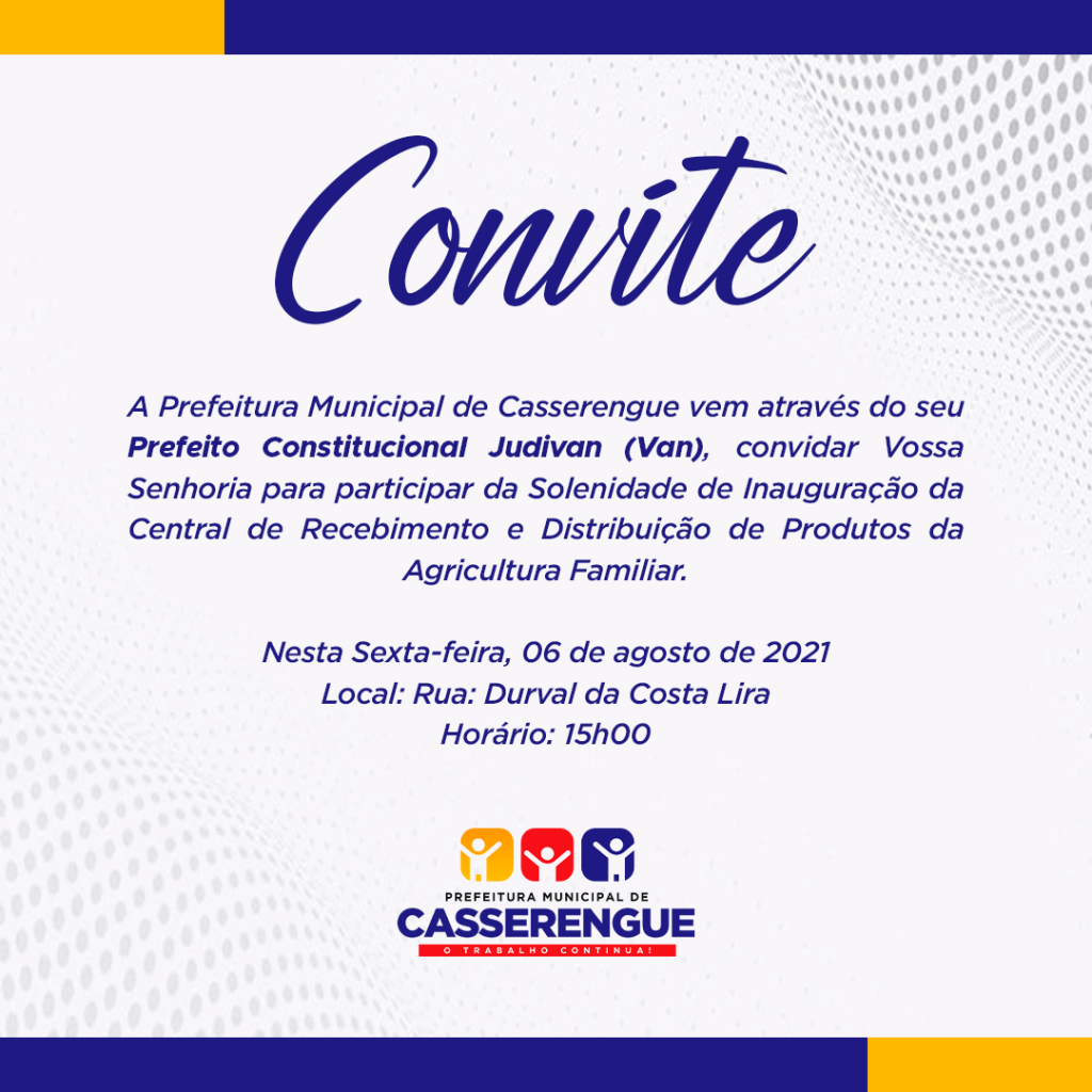 A Prefeitura Municipal de Casserengue vem através do seu Prefeito Constitucional Judivan (Van), convidar Vossa Senhoria para participar da Solenidade de Inauguração da Central de Recebimento e Distribuição de Produtos da Agricultura Familiar.