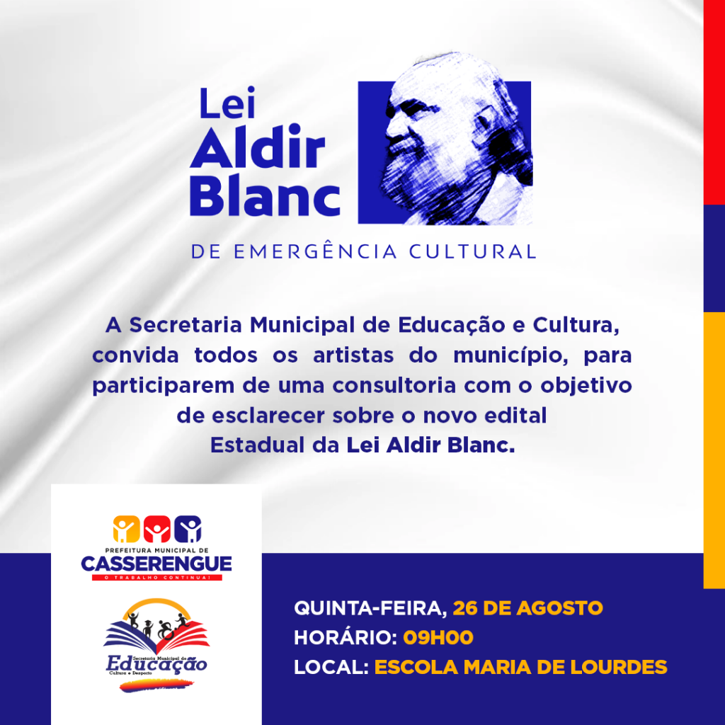 A Secretaria Municipal de Educação e Cultura, convida todos os artistas do município, para participarem de uma consultoria com o objetivo de esclarecer sobre o novo edital Estadual da Lei Aldir Blanc.
