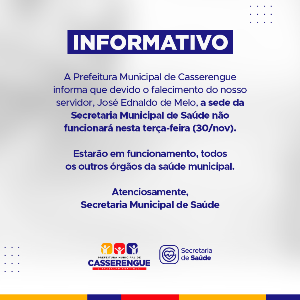 A Prefeitura Municipal de Casserengue informa que devido o falecimento do nosso servidor, José Ednaldo de Melo, a sede da Secretaria Municipal de Saúde não funcionará nesta terça-feira (30/nov).